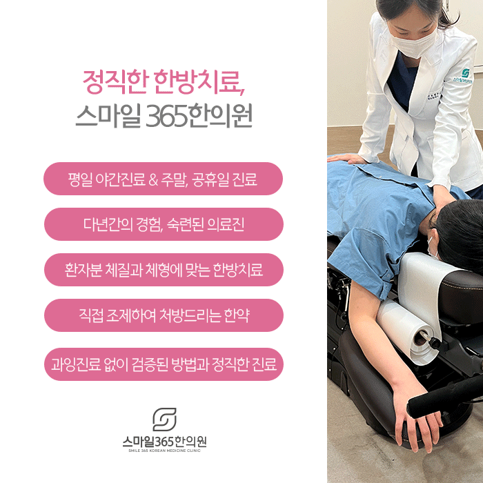 스마일365한의원에서는 성내동 배뇨장애치료와 방광염 회복을 도와드립니다. 그리고 신체 통증, 교통사고후유증, 1:1 맞춤 다이어트, 어린이 성장, 여성질환, 불안장애, 수면장애, 스트레스, 공진단, 경옥고, 1:1 맞춤보약 등 진료합니다.